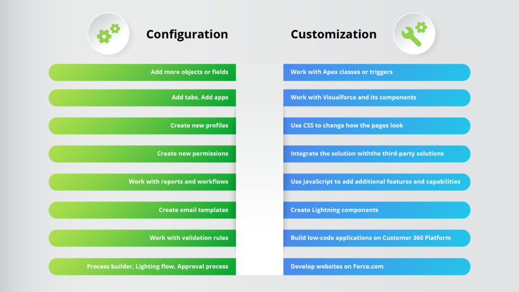 Salesforce customization means enhancing or altering the original Salesforce application to align with the exact needs of the organization. This process is one step ahead of the configuration, which allows you to bring in features and functionalities that are not part of the application.