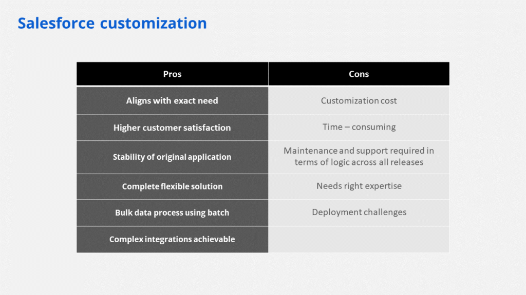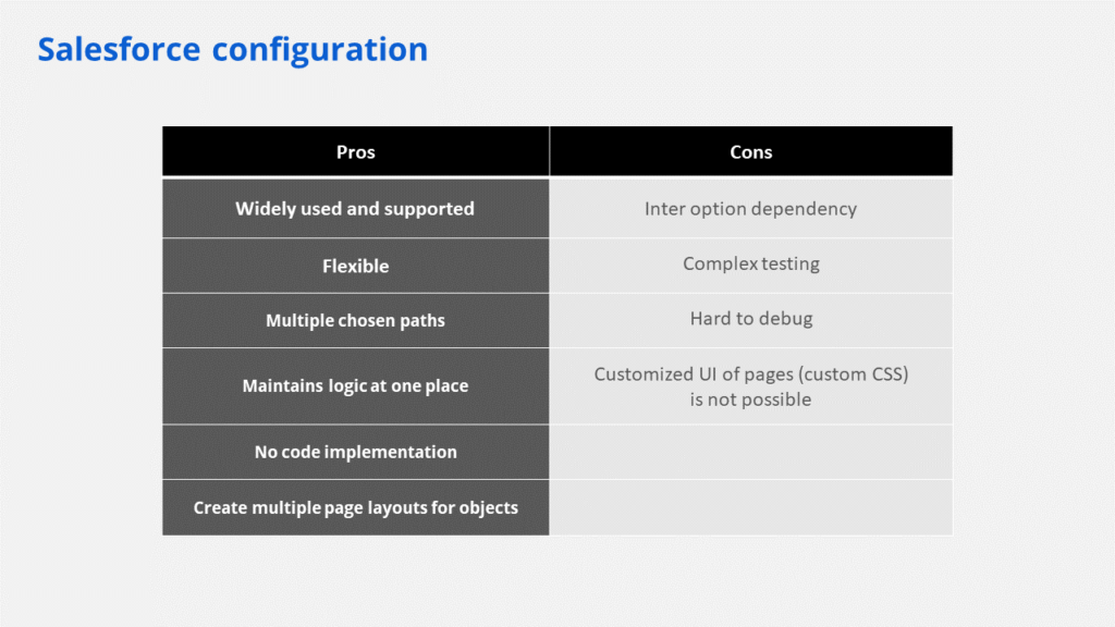 Whether you opt for a Salesforce configuration or a Salesforce customization, each one comes with its own sets of advantages and challenges. Here is table that will help analyze each method quickly: