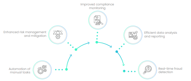 - Simplified Compliance Monitoring: AI simplifies regulatory compliance monitoring by swiftly analyzing extensive datasets against relevant regulations and policies. It detects anomalies and potential breaches, generating timely alerts for investigation. This ensures ongoing compliance while reducing manual effort.