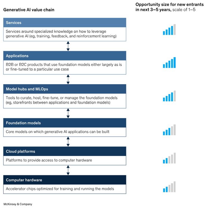 As generative AI systems are being created and utilized, a fresh value chain is arising to facilitate the training and utilization of this potent technology. At first glance, it might appear quite akin to the conventional AI value chain. In essence, out of the six main categories—computer hardware, cloud platforms, foundation models, model hubs and machine learning operations (MLOps), applications, and services—only the inclusion of foundation models is novel.