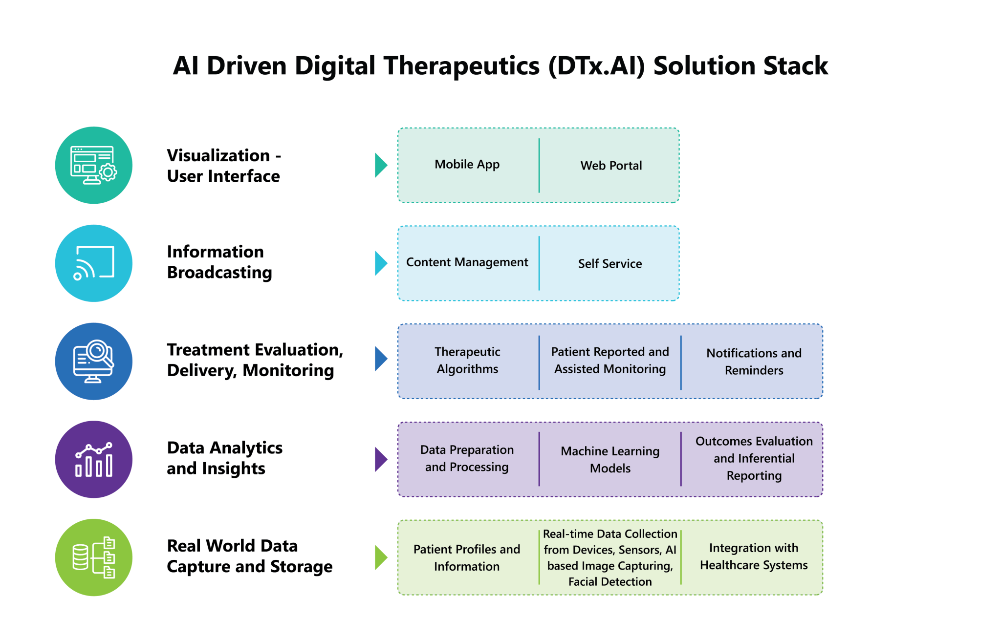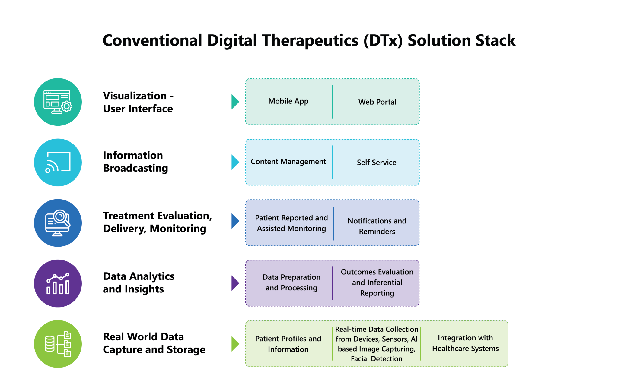 Standard DTx architectures focused on capturing and analyzing real-world patient data to support personalized care through mobile and web platforms. They enabled real-time data collection from wearables, devices, sensors, and medical equipment while facilitating connectivity with Electronic Medical Records (EMRs). They also offered data analytics, insights, treatment evaluation, monitoring tools, and extended support for cognitive behavioral therapy, gamification, lifestyle management, and wellness awareness.