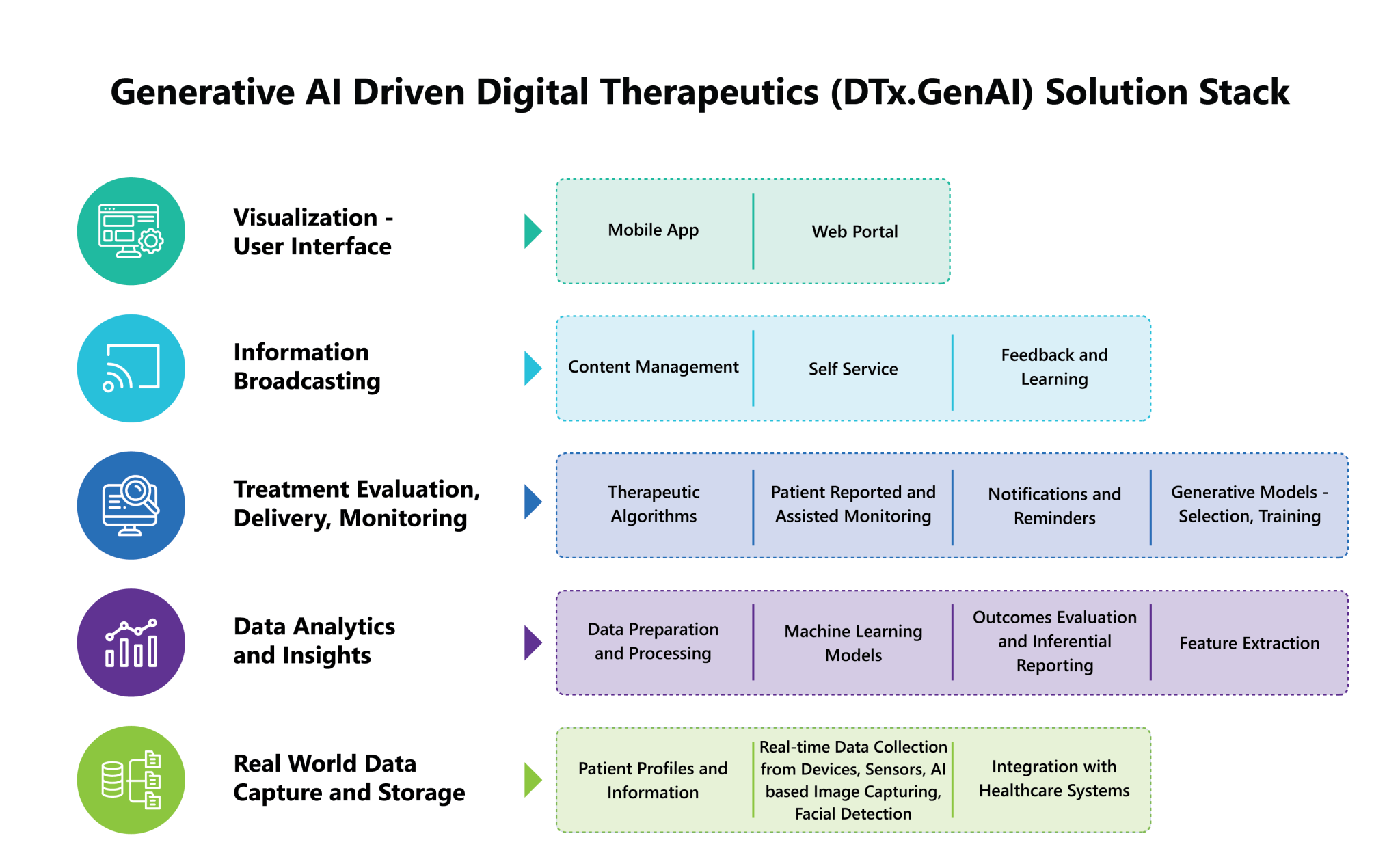 DTx.GenAI will leverage generative models for selection and training, utilizing deep learning, reinforcement learning, and autoencoders for model selection. These capabilities facilitate the creation of new content resembling real-world data/ content from the machine learning model, and existing data. The training capability helps create newer data/ content resembling real world data/ content. A constant quest between creating close-to-real data and distinguishing real from created data helps refine the model. This generative AI capability enables simulations and training for patients and healthcare providers, optimizing treatment plans and post-treatment care. For pharmaceutical companies, this capability helps arrive at insights and predictive analytics, extrapolating beyond the available real population and data.